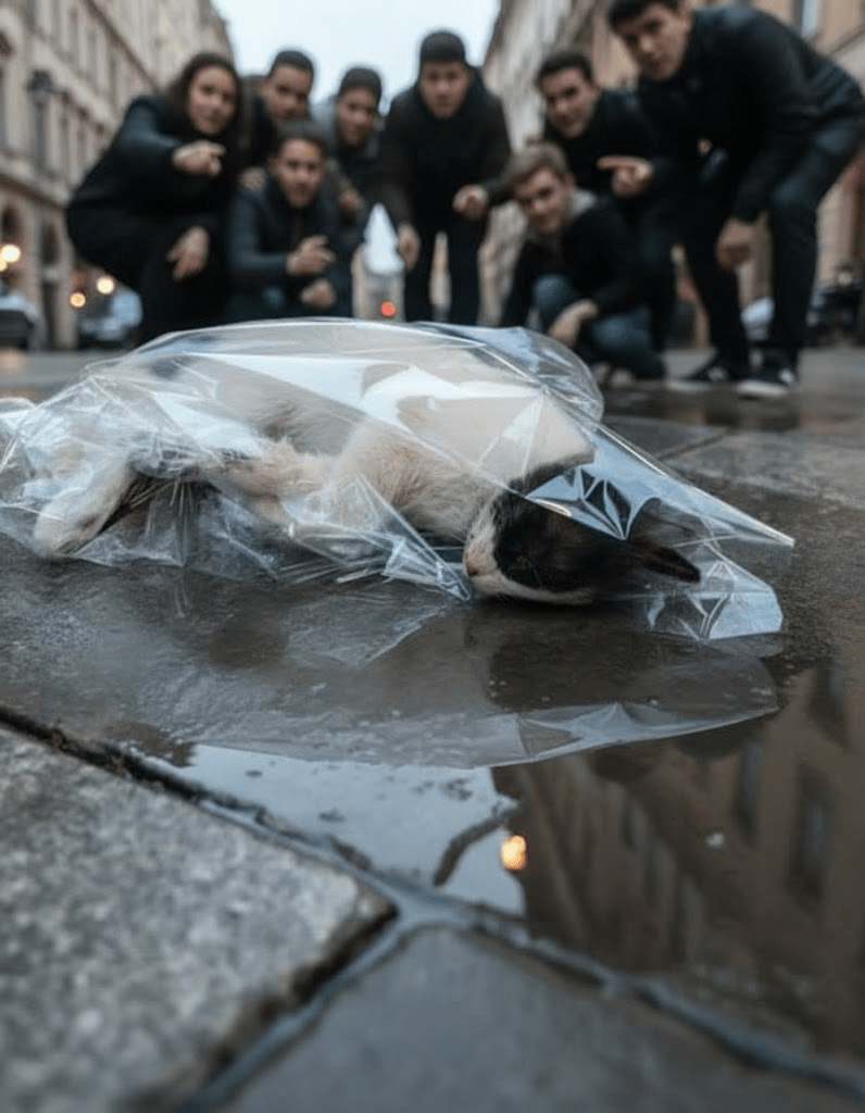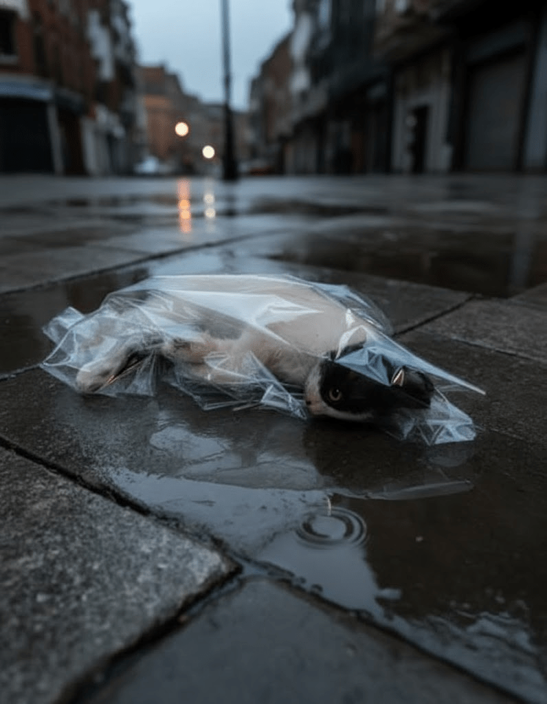 The discovery was jarring, a scene that would haunt the quiet street for days. On a rain-slicked pavement, nestled beside a dark puddle, lay a transparent plastic bag. Inside, curled in an unnatural repose, was a cat – a calico, its fur a mix of white, black, and ginger, now dulled by the condensation clinging to the plastic. The air hung heavy with recent rain, mirroring the sudden weight in the hearts of those who passed by. Was it a cruel prank? An abandonment of the most callous kind? Or something far more complex, a silent story waiting to be unfurled from the folds of desperation and resilience? This was no ordinary stray; this was a mystery entombed in plastic, a chilling tableau that demanded answers and ignited a fierce wave of concern across the community.