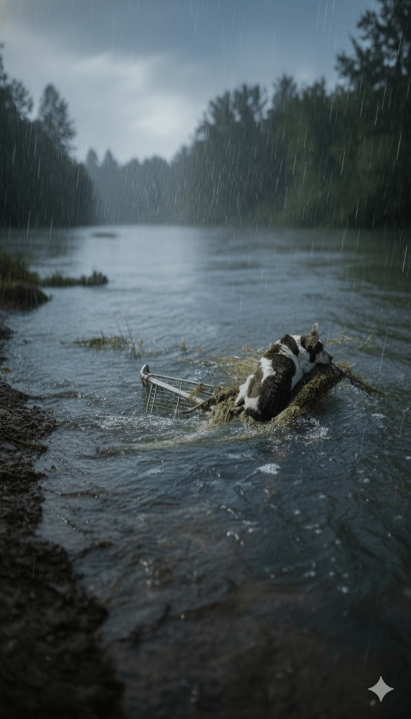 The world had dissolved into a watery chaos. Rain, relentless and unforgiving, lashed down upon the swollen river, transforming it into a raging torrent. Amidst this terrifying deluge, a small, nameless dog clung precariously to the rusty frame of a half-submerged shopping cart. His fur, a mosaic of brown and white, was matted and heavy with water, his eyes wide with a primal fear that mirrored the storm’s ferocity. He was a tiny island of life, adrift in an ocean of despair, his only anchor the flimsy, weed-entangled metal.