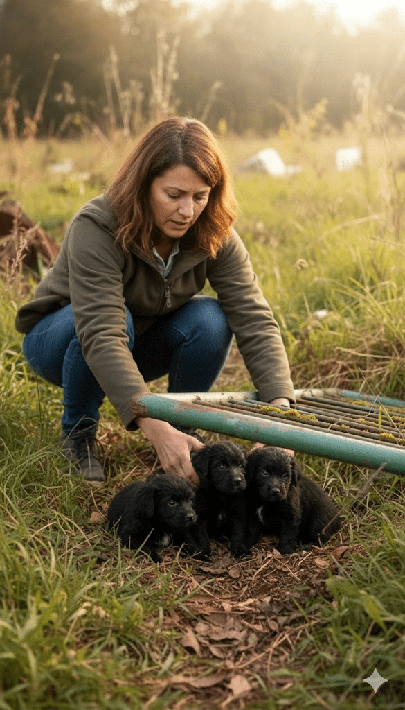 A tiny, scruffy black puppy, no bigger than her hand, was trapped beneath a rusty, green metal frame, its small body barely moving. His eyes, wide with fear and exhaustion, met hers, and in that instant, Sarah’s heart shattered. He was not alone; several other puppies, equally frail and terrified, huddled together nearby, attempting to hide amidst the debris. It was clear they had been abandoned, left to fend for themselves in this desolate place. The puppy under the frame seemed the weakest, barely breathing, its fur matted and dull. Sarah knew she couldn’t leave them. Without a second thought, she gently lifted the metal frame, her hands trembling as she carefully scooped up the little black bundle.