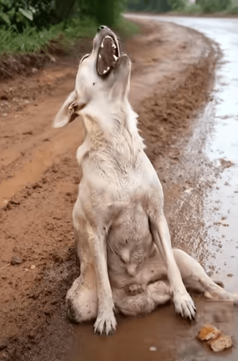 The image is a stark tableau of despair: a white dog, matted with mud, sits slumped in a roadside puddle,…