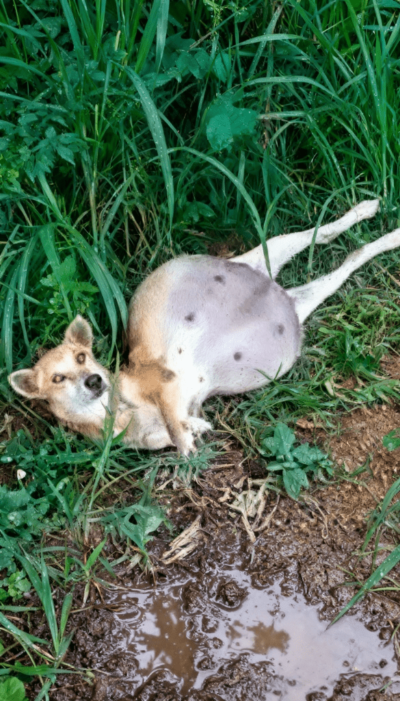 The image of a dog, splayed on her back in the mud and grass, her belly distended to an alarming…