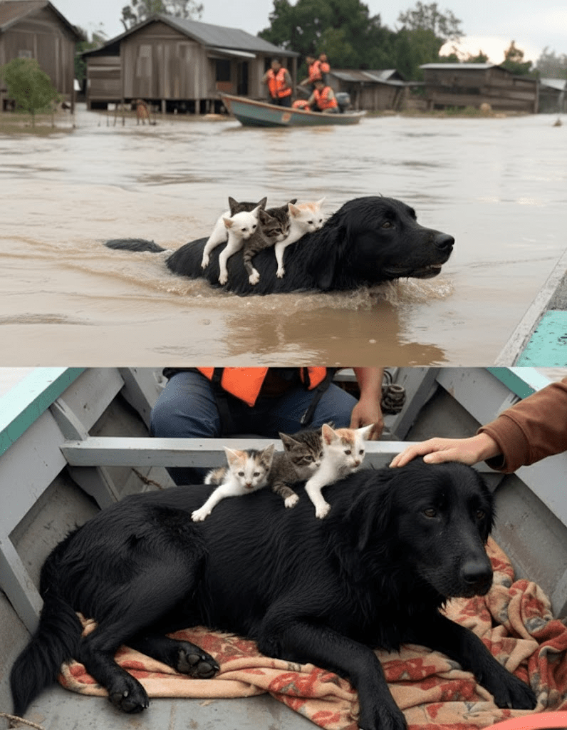 The floodwaters raged, a terrifying, fast-moving wall that swallowed homes and hopes in its relentless surge. Rescue teams, battling the powerful currents, were pushing against nature’s fury when a sight emerged that brought them to a halt. It was a dark shape, moving with improbable purpose through the debris-strewn deluge. At first glance, it appeared to be just another piece of the destruction, until keen eyes caught the unmistakable glint of eyes, followed by the appearance of ears. But then, a gasp rippled through the boat – clinging desperately to the dog’s back were three tiny, sodden kittens. The river, strong enough to sweep away vehicles, was no match for this canine’s quiet, unyielding determination. Each paddle stroke was slow, deliberate, a testament to an innate understanding of the precious cargo it carried, its body held rigid to ensure the kittens’ precarious grip remained unbroken. The tiny felines, shivering and soaked to the bone, held on for dear life, their trust absolute.